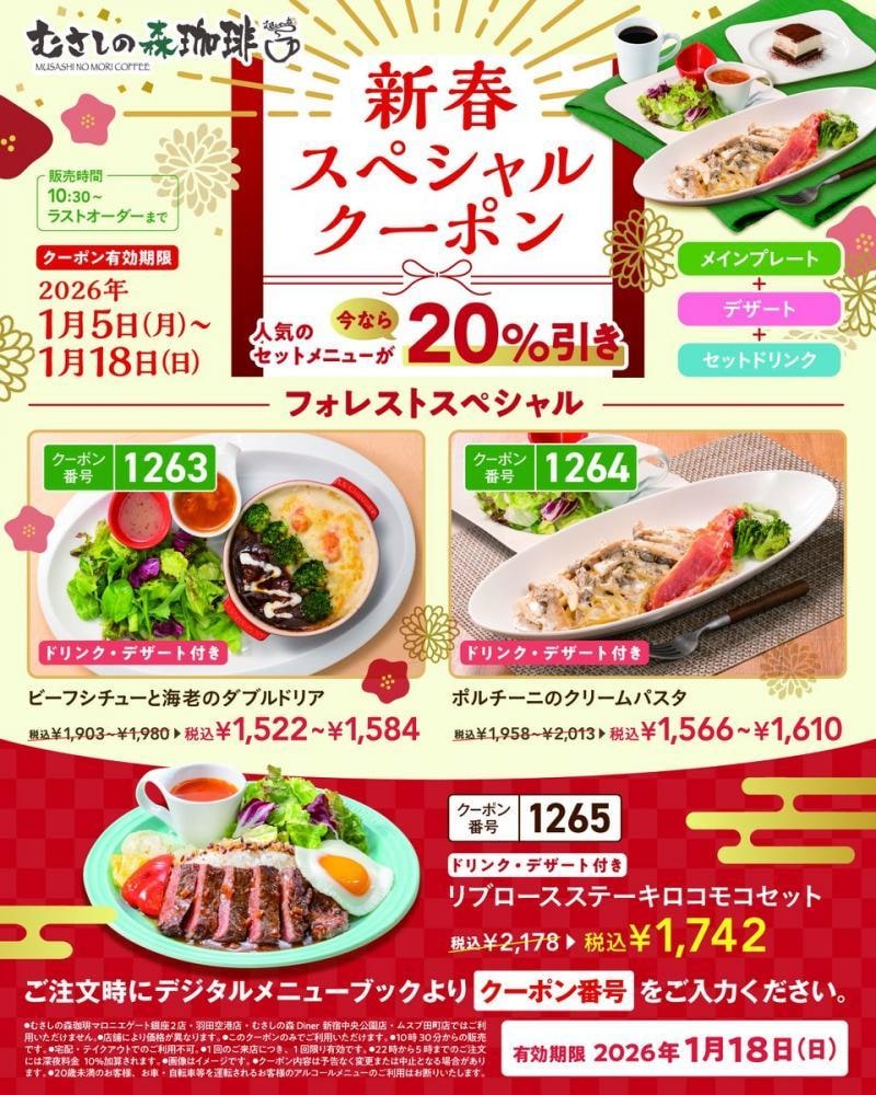2026年1月14日現在、むさしの森珈琲の公式Xでは、人気のセットメニューが20%オフになる「新春スペシャルクーポン」を公開しています。