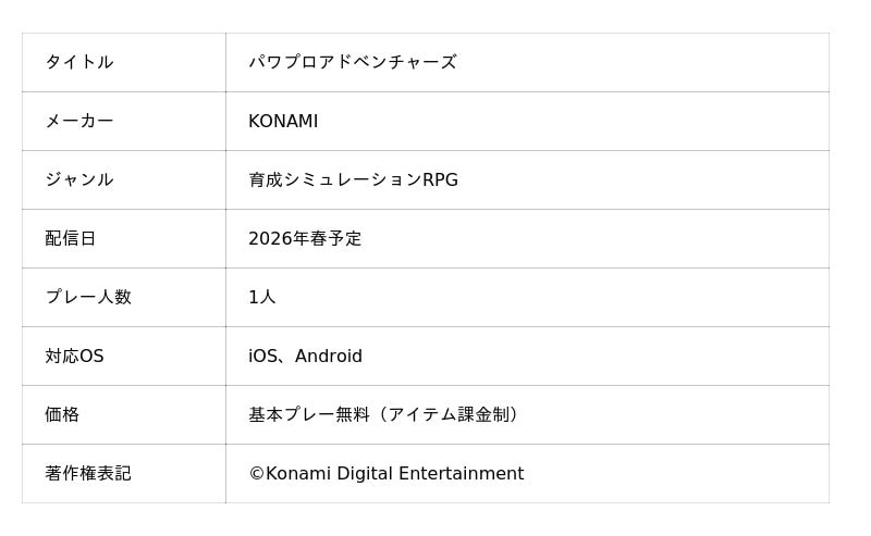 株式会社コナミデジタルエンタテインメントは、新作モバイルゲーム『パワプロアドベンチャーズ』(以下『パワアド』)を2026年春から配信することをお知らせします。また本日より事前登録を開始しました。