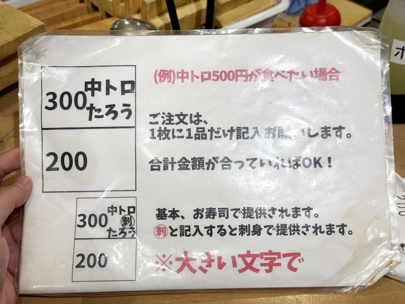 どんどん食券に寿司名と名前を書いてオーダーしてしまいます。