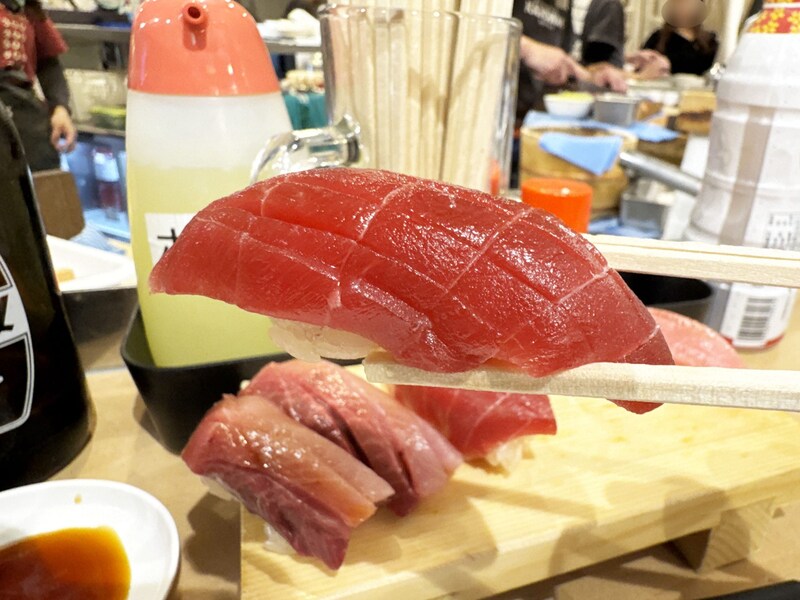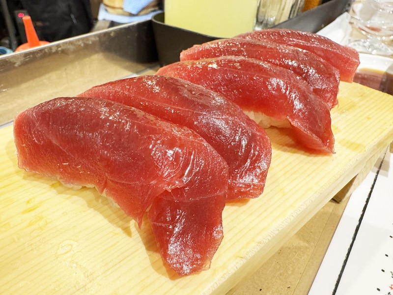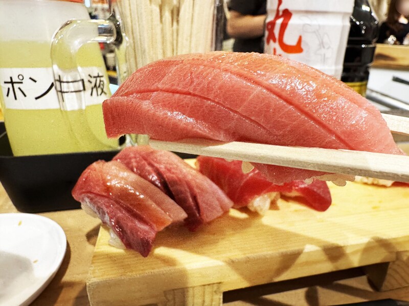 目の前にやってきたマグロもブリも、かなり厚切り!