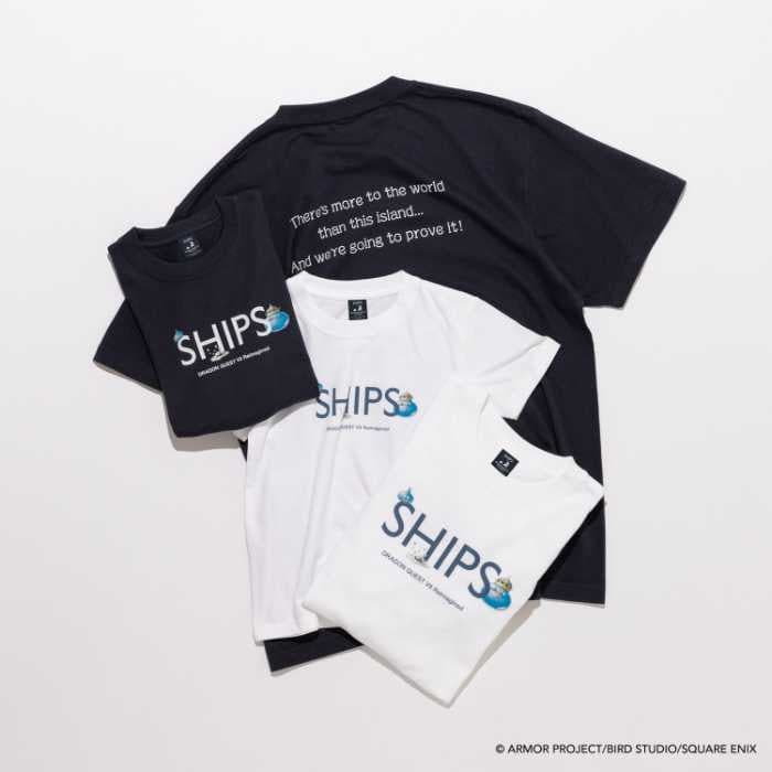 またロゴTシャツは各6,600円、S〜XL展開。SHIPSロゴにスライム、キングスライム、はぐれメタルをあしらい、背面には印象的なステートメントを大胆に配置。
