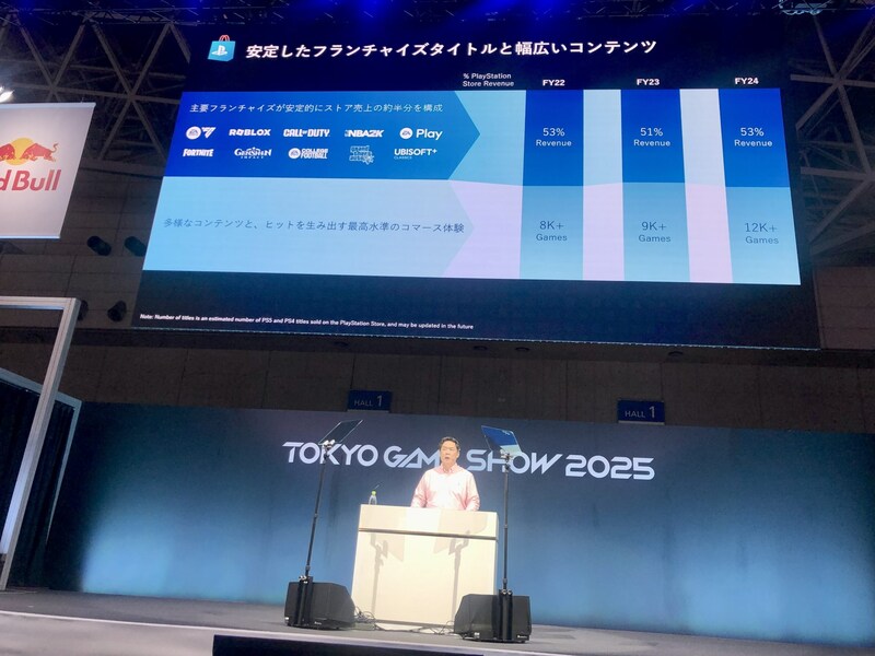 続けてプレイステーションが築き上げてきたプレイヤー・クリエイター間の「エコシステム」としての存在感に話題は移る。ハードだけではなく、ソフト、サービス、コミュニティが一体となることで「遊びの場」としての価値を広げ、その中心にあるのがプレイステーションストア(PS Store)なのだと語った。PS Storeはいまや年間数兆円規模の売上を支える巨大プラットフォームに成長し、単なる販売チャネルを超えてゲーム業界全体の収益構造を左右する存在となっている。