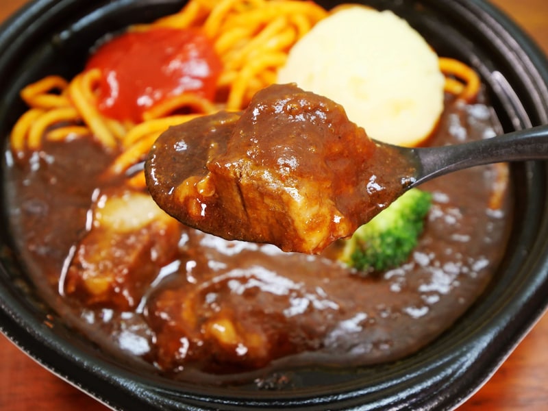 極めてディープなコクを楽しませてくれるビーフシチューがたっぷりと入った逸品。老舗の洋食店のビーフシチューにも負けない上品な仕上がりで、牛肉の甘味も極上。ナポリタンがやや多めなので、比率的にビーフシチュー多めのほうが嬉しいが、どうであれビーフシチューとしての完成度が高いのは事実だ。