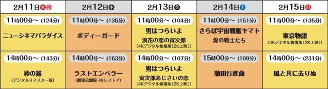 邦画作品は、人間の宿命と親子の絆を壮大なスケールで描いた野村芳太郎監督作品「砂の器」をはじめ、家族の姿を通して日本人の心の原風景を静かに見つめた小津安二郎監督作品「東京物語」、日本中を笑いと涙で包み込んだ山田洋次監督作品「男はつらいよ」シリーズが上映されます。