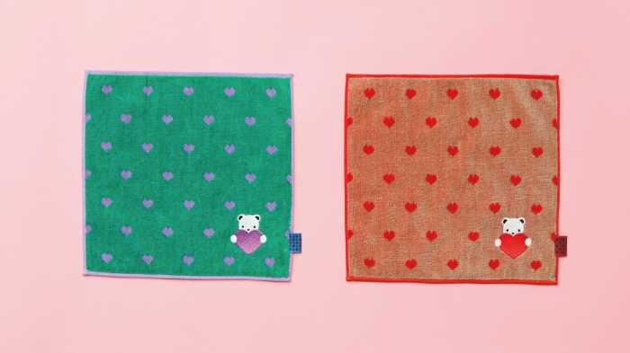 タオルハンカチは価格2,530円(税込)で、ハートを抱えたクマちゃんの刺しゅう入り。