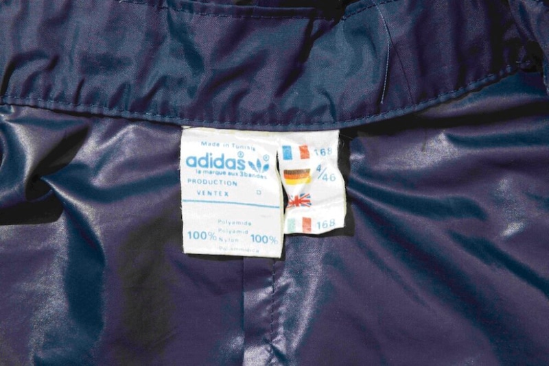 60sのトレフォイル無し“adidas”タグから、トレフォイルロゴと®が追加されたタグへ移行。この青タグ期は初期アディダスヴィンテージの象徴。