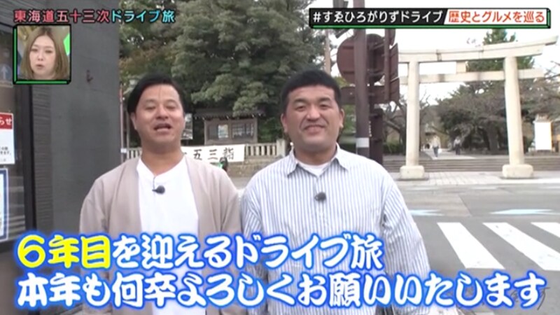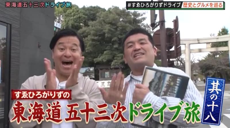「すゑひろがりずの東海道五十三次ドライブ旅」は、“令和の弥次さん喜多さん”ことすゑひろがりずが、東海道五十三次の宿場町を京都から車で巡り、ゴールの東京・日本橋を目指す行き当たりばったりのドライブ旅。2021年に始まった旅もいよいよ6年目に突入! 残り10宿となった今回は、静岡県内最後の宿、43宿目の「三島宿」からスタートする。