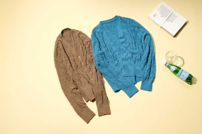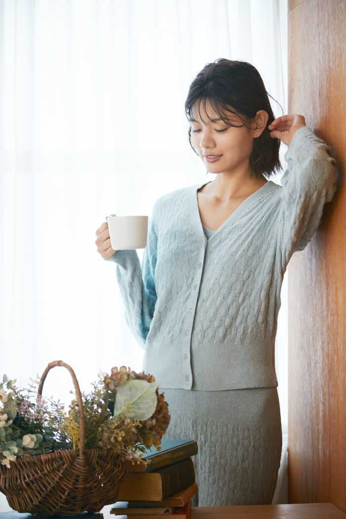 Vネックカーディガン(¥7,920税込)はさらりと羽織れる軽やかさで、室内の冷え対策にぴったり。どちらも程よい丈感でストレスフリーに着られ、季節を問わず活躍するアイテムです♪