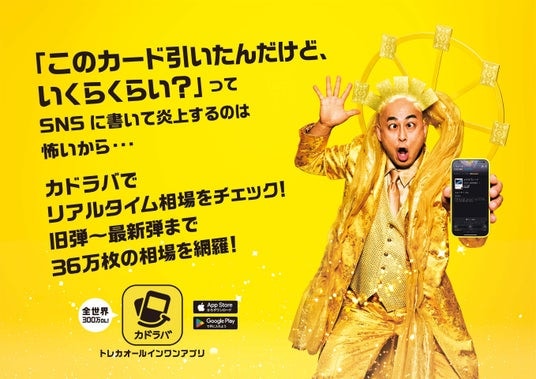 「カドラバ」は、安全なカード取引、デッキ構築とコミュニティを含む、世界最大級のトレーディングカード・オールインワンアプリです。新WEB CMでは、ネットのデッキ情報に振り回される高橋ひかるさんのもとへ、錦鯉・長谷川さん扮する「トレカの神(トレ神)」が降臨。電撃や旋風が吹き荒れるなか、「カドラバ」での情報チェックやデッキ丸ごと購入を伝授します。カードを円形に配した背中の装飾や頭に刺さったカードなど、トレカの神さまならではの神々しい衣装にもご注目ください。