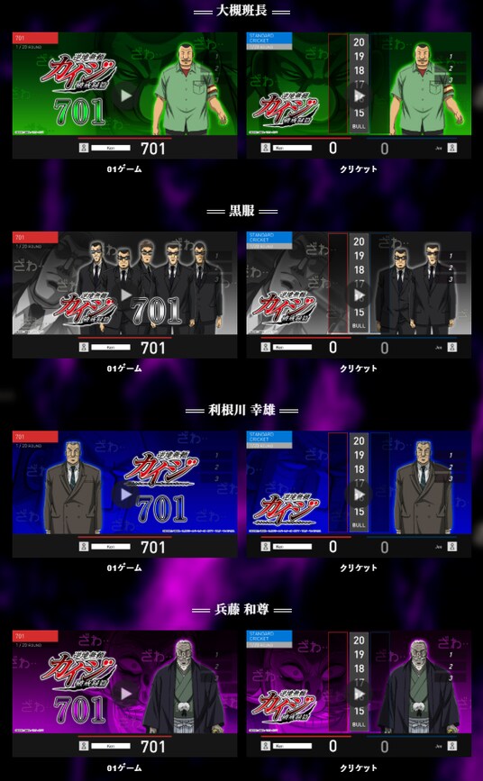 アニメ『カイジ』に登場する人気キャラクターたちがゲーム背景に設定できるデジタルコンテンツです。特定の点数にダーツが刺さると、各キャラの名シーンを見ることができます。