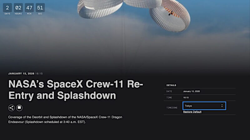 4人の飛行士が搭乗するクルードラゴン宇宙船は、1月15日7時05分にISSから離脱(※1)、17時41分ごろにカリフォルニア州沖へ着水する予定になっています。NASA(アメリカ航空宇宙局)はハッチの閉鎖やISSからの離脱、そして着水について、NASA+などでライブ配信を予定しています。