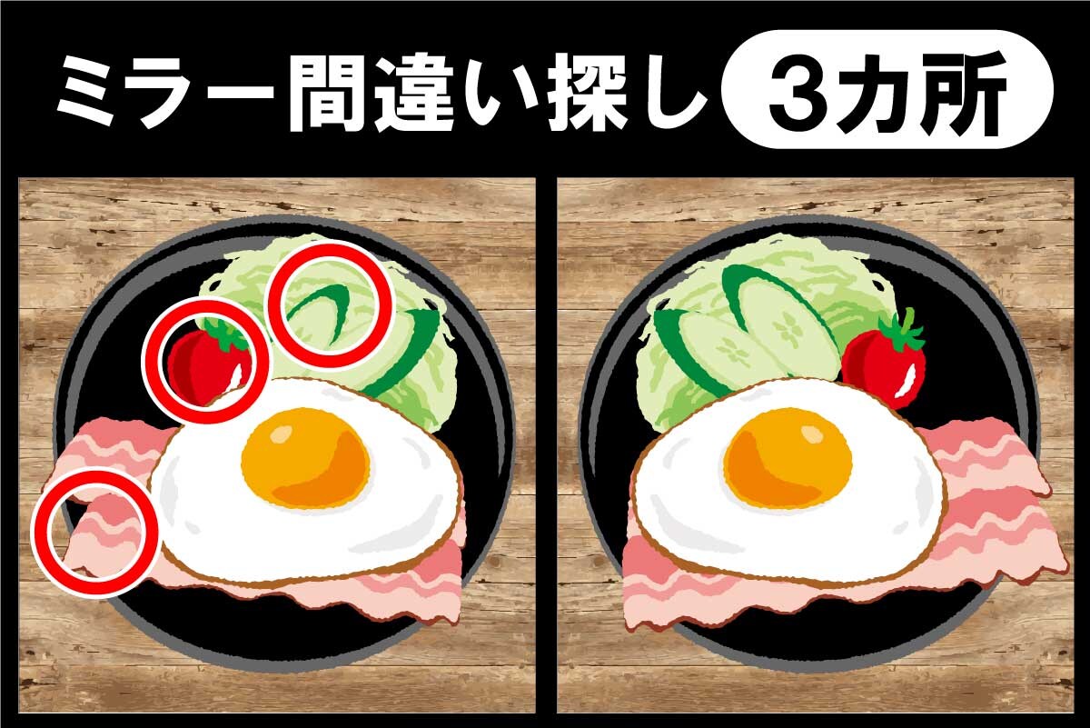 3カ所の違いは、1.きゅうりの大きさ、2.トマトの向き、3.手前のベーコンの大きさでした!