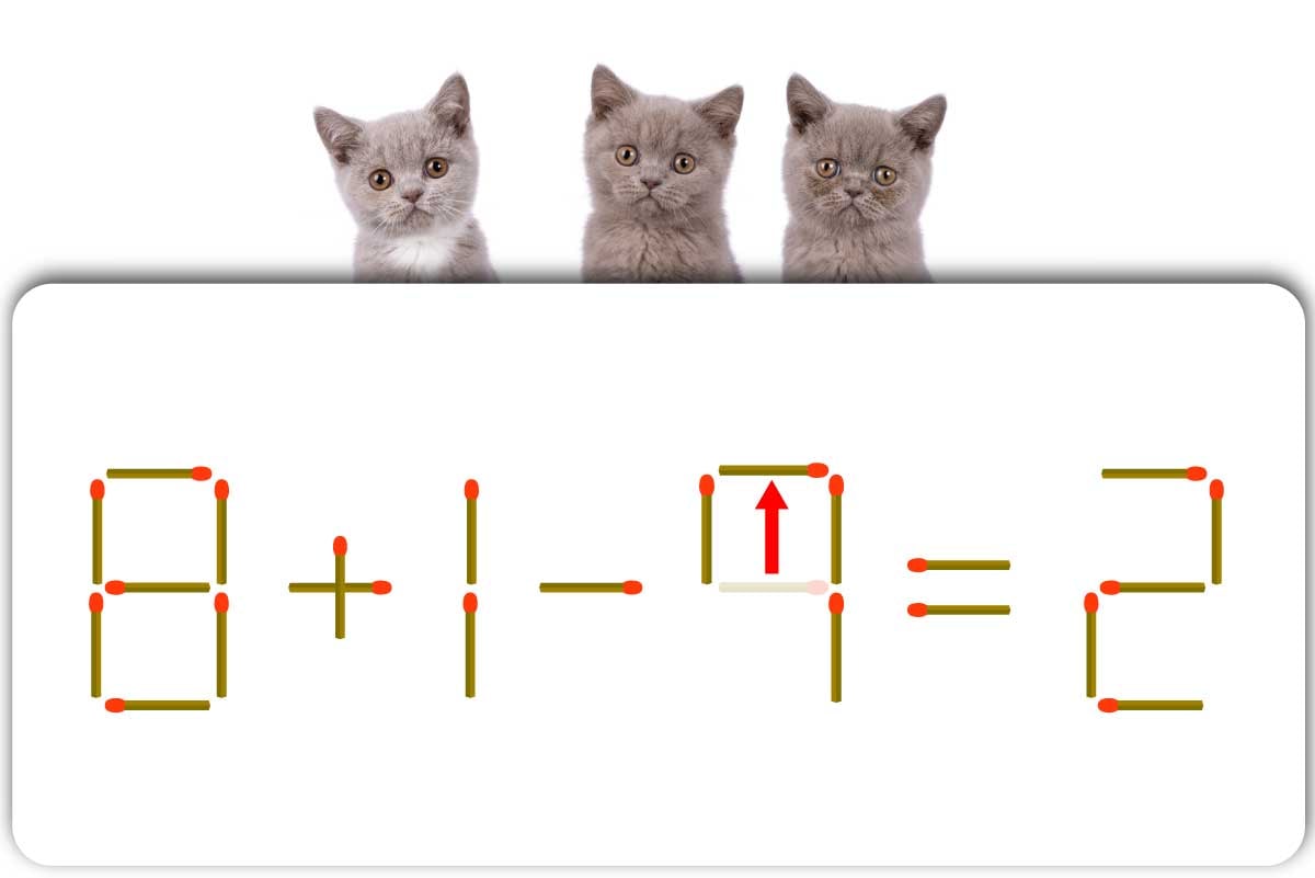 「4」の横マッチ棒を1本移動させて「7」を作り「8+1-7=2」にする。※解答は複数ある場合があります。