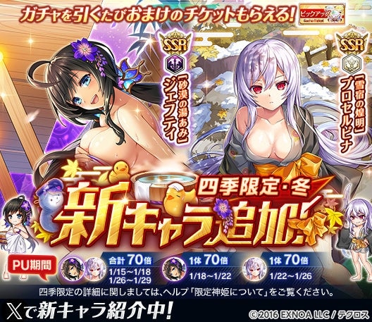 合同会社EXNOA(本社:東京都港区、CEO:東條 寛、URL:https://games.dmm.com/ )が運営するDMM GAMESにおいて『神姫PROJECT』は、「ジェフティ」「プロセルピナ」が新衣装で登場することを発表した。さらに毎日最高100連のルーレットガチャも開催中。
