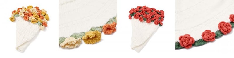 「フラワーブーケスロー」は、くるくると丸めると花束のようになる、かぎ編みスローです。花びらのフォルムも美しく、お花は一輪一輪丁寧に手編みされています。
