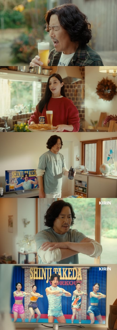 豊川演じる“ちょっと頑固な父”と、中条あやみ演じる“イマドキな娘”の会話を通じて、「一番搾り 糖質ゼロ」の魅力と「糖質とおいしさは無関係」というメッセージを訴求する本CMシリーズ。今回は年末年始に食べ過ぎてしまった豊川が「糖質ゼロ体操」の動画を見ながらトレーニングに励むという設定だ。