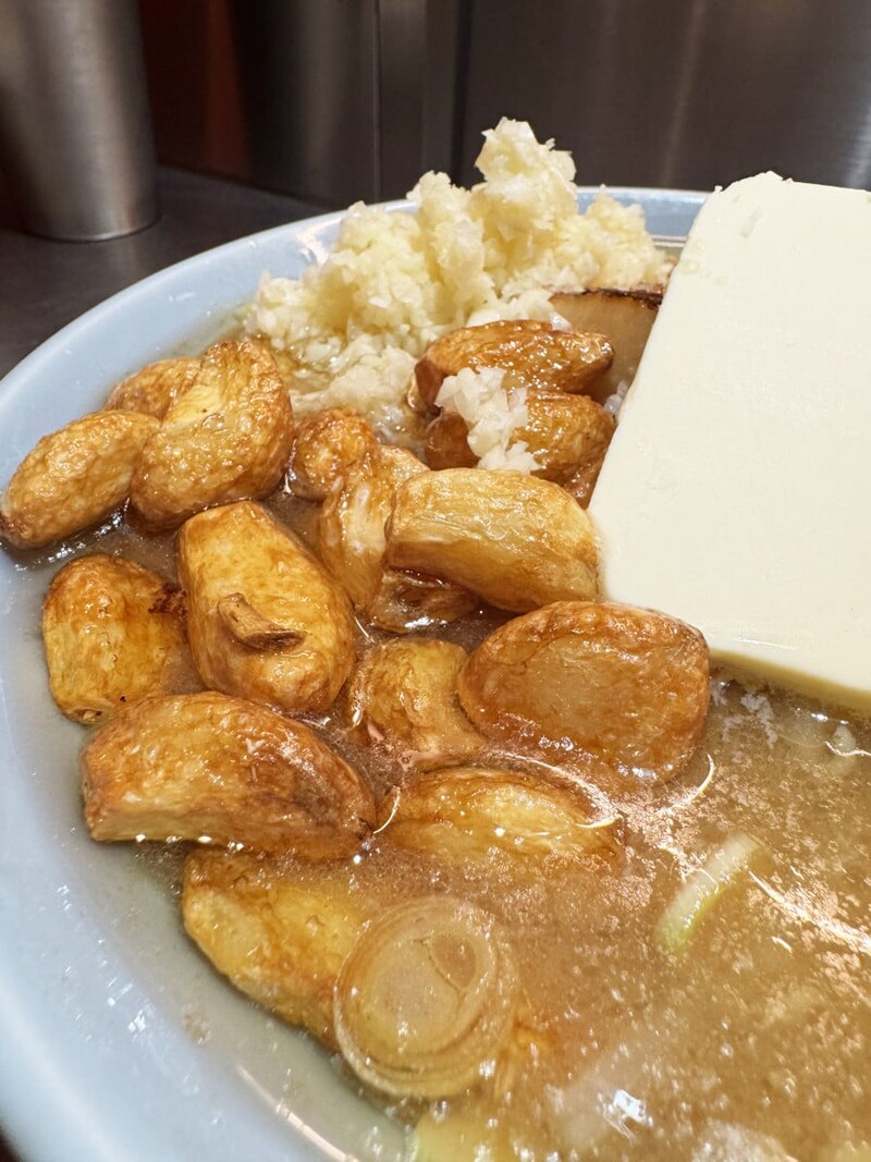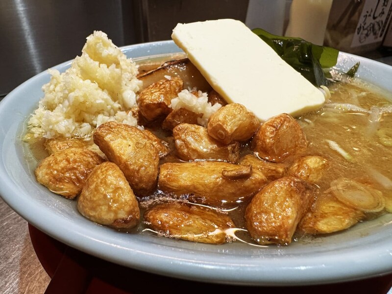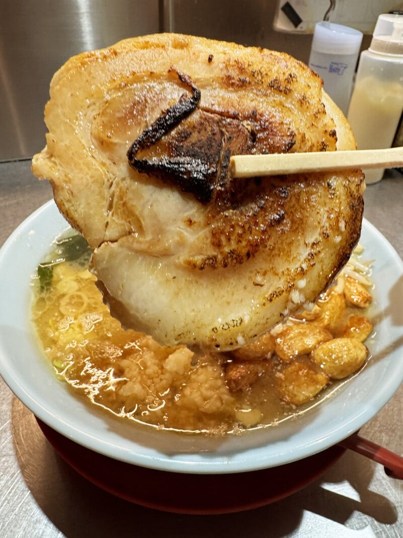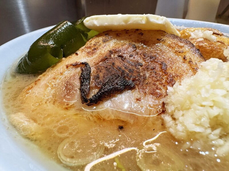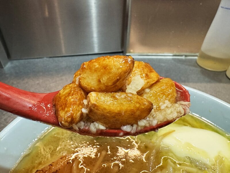揚げニンニクは完全に食材そのものの味! それだけをずっと食べ続けると厳しいものがあるが、濃密濃厚なコクと旨味のスープとともに揚げニンニクを食べれば、ピュアなニンニクの味がスープに新たなおいしさを付加してイイ感じに着地。
