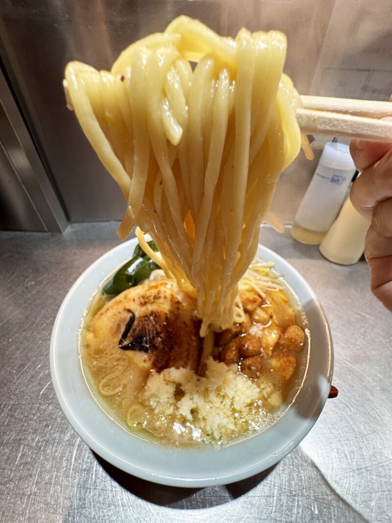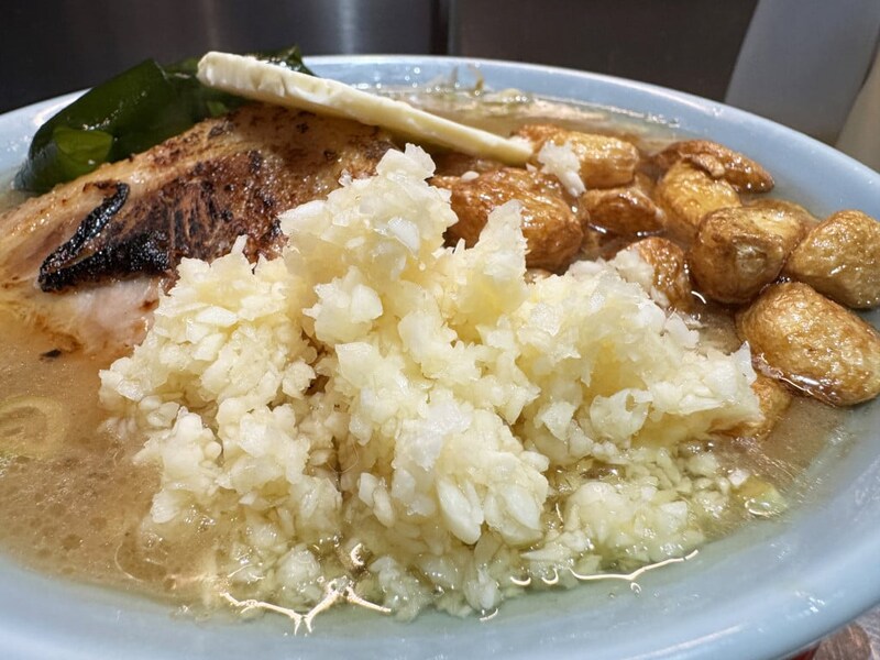 目視で確認できるだけで10個以上の揚げニンニクが含まれていた。さらにニンニクは揚げニンニクだけではない。フレッシュな刻みニンニクも大量に山盛りなのである。まさにニンニクによるニンニク好きのためのニンニクラーメンであり、ニンニクが好きならば絶対に喜ぶラーメン。