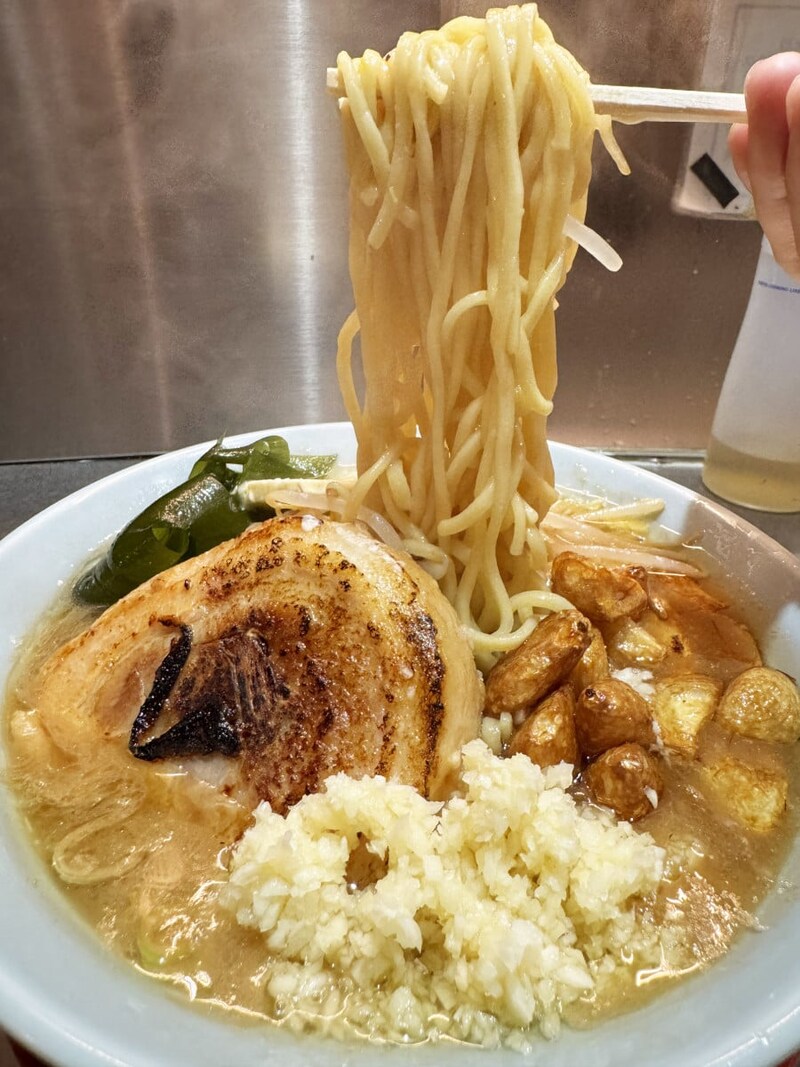 ニンニクだらけの湖面に沈む麺をサルベージ。湯気とともに、ニンニクの薫りが立ち昇る。すさまじいニンニクの存在感! 麺はツルツルでなめらか系。ズズッとすすって驚き! 超絶ニンニクでパワフルそうなのに、スープがからんだ麺は極めて上品かつ旨味濃厚で甘美! 単にニンニクの力で強引に引っ張るラーメンじゃない! 奥深い! うっめええええ!!