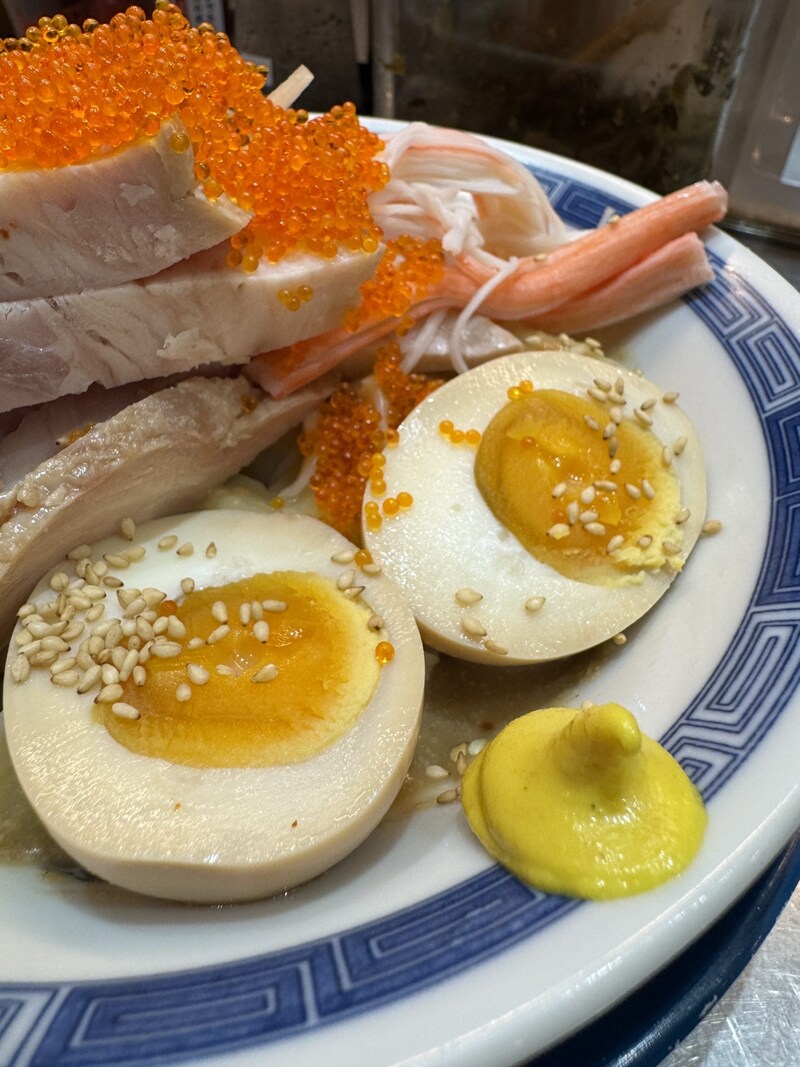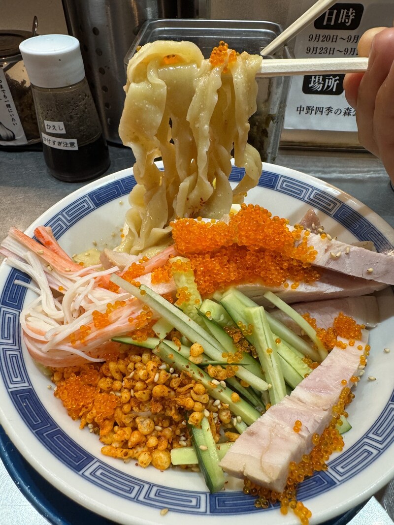 冷やし中華は驚くほど具だくさん。カニカマ、とびっこ、キュウリに玉子、そして深紅の揚げ玉。具、具、具だらけ。そしてチャーシューがガッツリ大サイズで嬉しい。まずは勢いよく、麺をズズッとすする! 深紅の揚げ玉がサクサクカリカリしててウマイ! ヤヴァ楽しい! 楽しいしうんまい。