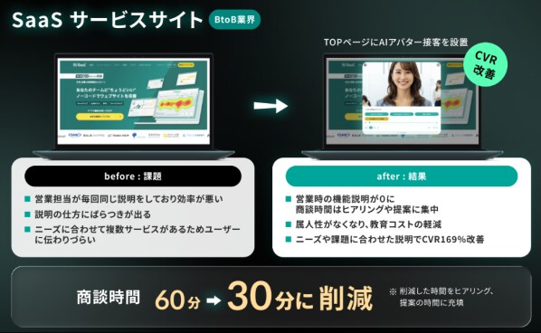 サイト訪問者の行動履歴や閲覧状況に応じて、AI アバターが自然な対話で情報提供・課題ヒアリング・次のアクション誘導を行うことで、従来の “見るだけのサイト” から “体験するサイト” への転換を可能にします。