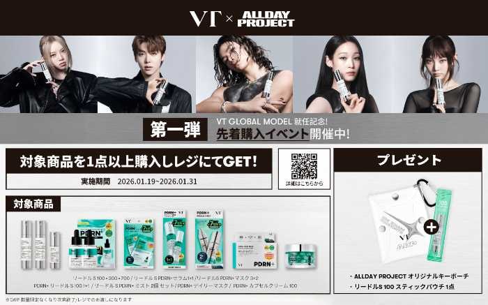 第一弾ではVTの対象商品を1点以上購入すると、VT×ALLDAY PROJECTオリジナルキーポーチとリードルS100スティックパウチ1点をプレゼント。