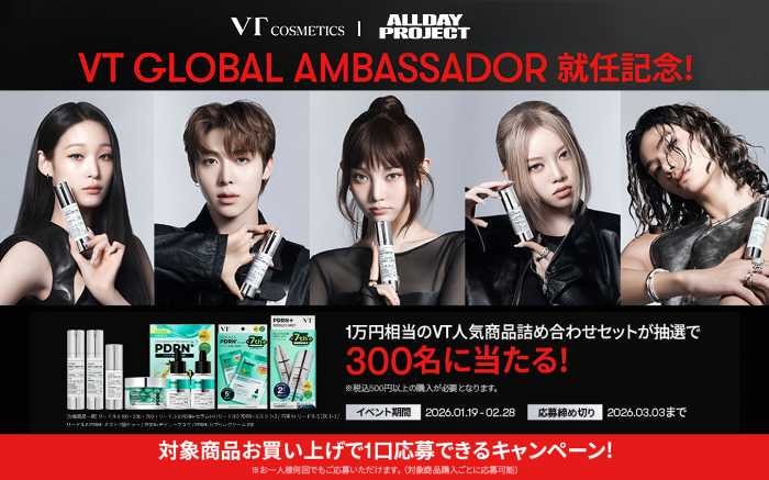 韓国発スキンケアブランドVT COSMETICSが、グローバルアーティストALLDAY PROJECTをGLOBAL AMBASSADORに起用。この特別な就任を記念し、全国の対象店舗での購入キャンペーンや、都内を走行するアドトラックなど、ファン心をくすぐる企画が続々と登場します。スキンケアを楽しみながら、推しとの特別な時間を感じられる今だけのチャンス♡見逃せない注目情報をまとめてチェックしていきましょう。