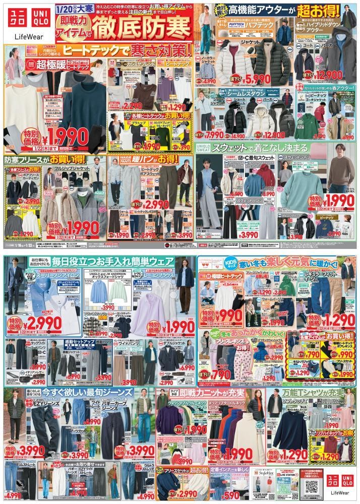 「ヒートテックブラタンクトップ」は1990円、「パフテックジャケット」は5990円、「ヒートテックボアスウェットパンツ」は2990円、「ファーリーフリースセット」は2990円など、値下げ価格の防寒アイテムが並んでいます。