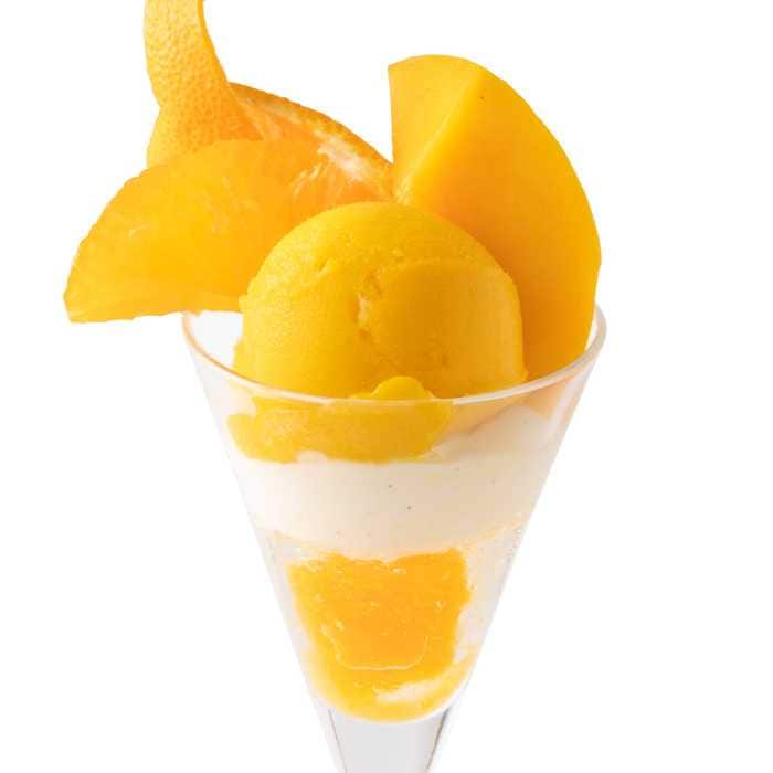 店内製造のマンゴーシャーベットに、マンゴーオレンジソース、コアントローゼリー、ディプロマットクリームを重ねた一品で、トロピカルな香りと爽やかな甘さが広がります。