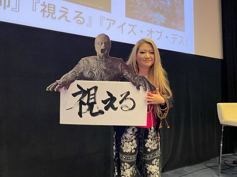 特別試写会でのギャル霊媒師・飯塚さん その場で邦題『視える』を揮毫