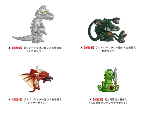 「大怪獣のアバたま」にコラボ限定の激レアお着替え「メカゴジラ」「ビオランテ」「ファイヤーラドン」、剣士用コラボ限定お着替え「ちびビオランテなりきりセット」が新登場!