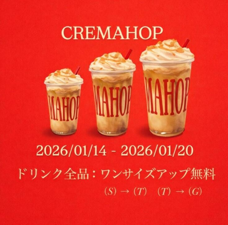 2026年1月14日から20日までの期間、無料でドリンクがワンサイズアップするキャンペーンを実施中です。