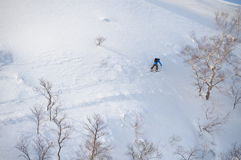健児はいまもアルペンビンディングのデュークという滑走重視のギアで山に入っている。TECビンディングに比べると切り替えの行程が多いため、できる限り無駄な行動を省く。