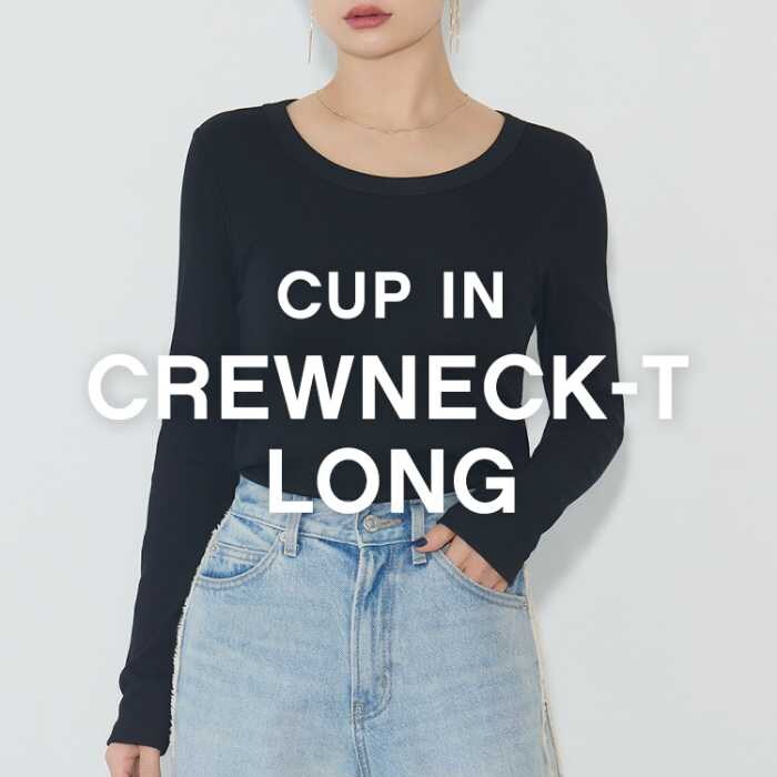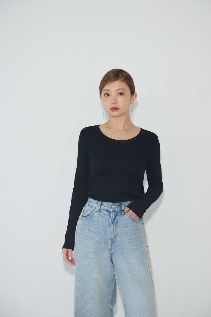 『バンビウォーター カップ イン クルーネックT ロング』(¥4,390税込)は、詰まりすぎないクルーネックでデコルテを綺麗に見せつつ、やや長めの袖丈がこなれ感を演出。