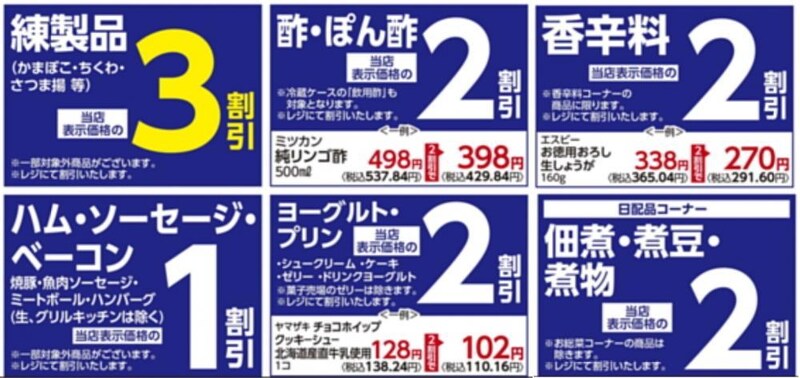 かまぼこ、ちくわ、さつま揚などの"練製品"は、レジにて店頭表示価格の3割引になります。一部対象外の商品もあります。