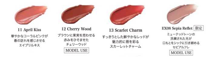 フュージングカラーリップスは新色4色(うち限定1色)各4,620円(税込)。12CherryWoodや限定色EX08SepiaRefletなど、クールさと温もりを併せ持つカラーが揃います。