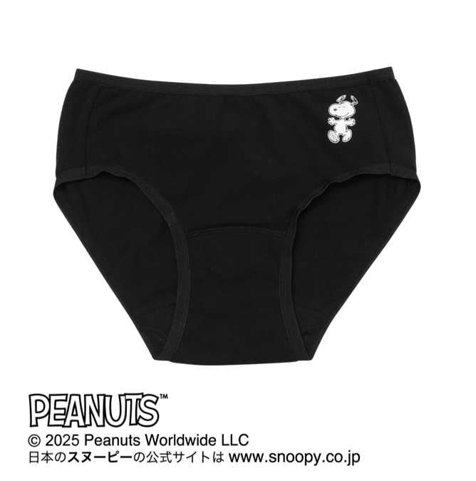 サニタリーアイテムも充実。「PEANUTS サニタリーショーツ」(1,430円・M/L)は羽根つきナプキン対応の浮きマチ仕様。ブラックのシンプルデザインでデイリー使いも可能です。