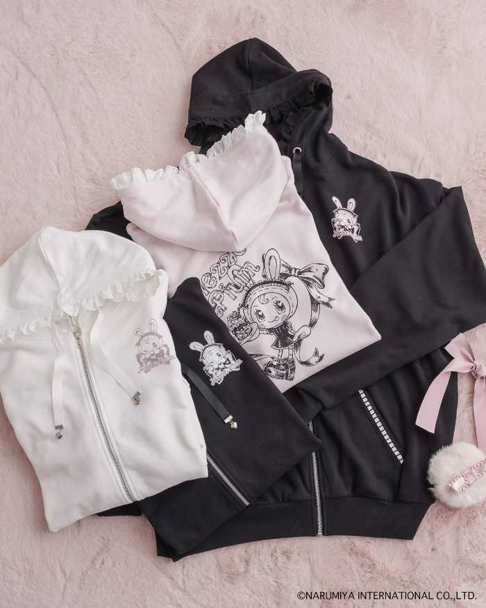 展開アイテムは全7種。pium×Mezzo Pianoベリエちゃんコットンフリルパーカーはホワイト/ピンク/ブラック×ピンク/ブラックの4色展開で12,000円(税込)。