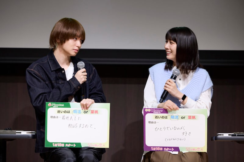 人気グループ「Hey! Say! JUMP」の伊野尾慧と俳優の松本穂香がダブル主演する1月18日スタートのドラマ『50分間の恋人』(ABCテレビ・テレビ朝日系、日曜午後10時15分)の会見が先日東京都内で開かれ、壇上には他にも、味方良介、黒田光輝、おいでやす小田、高橋光臣、木村多江が登場。ラブコメだけに、出演者同士のトークも終始和やかに行われた。