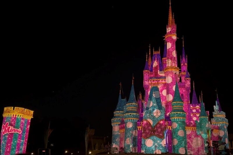 ポップな音楽に合わせてシンデレラ城にリボンやハートといったミニーらしいモチーフが映し出されるプロジェクションマッピングは必見。