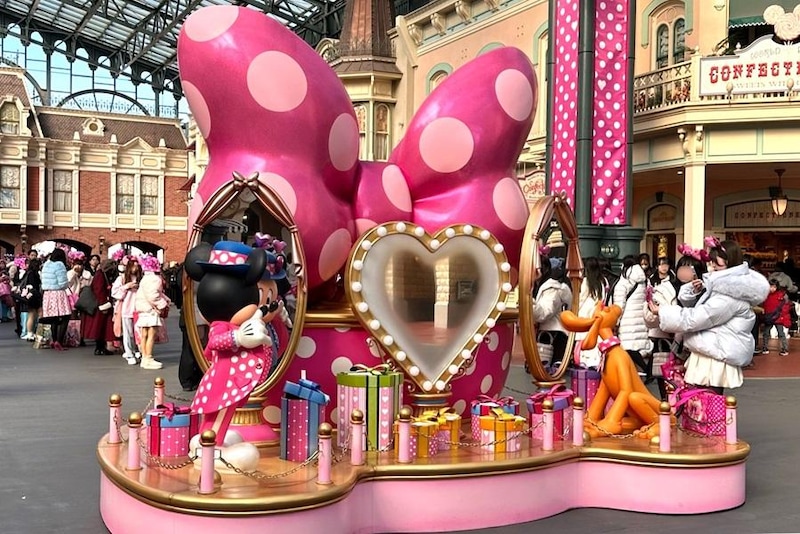 ワールドバザール中央には、大きなリボンのモニュメントがあり、エントランス前の花壇もミニーに。