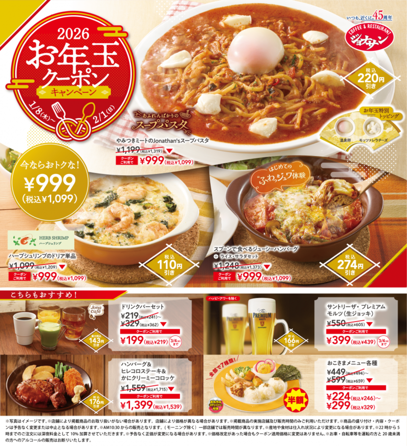2026年1月15日現在、ジョナサンの公式Xで最長26年3月4日まで使えるクーポンを公開しています。