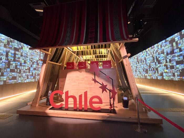 大阪・関西万博のチリパビリオンに入ると、華やかな手織り布が壮大に飾られています。情熱と温もりを感じる館内では、フレンドリーなスタッフが温かく迎えてくれます。大人気のイベント「無料ワイン試飲体験」は毎日開催されており、チリパビリオン公式インスタグラムにて参加募集されています。抽選に当選すると参加できます。