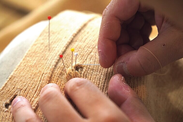 これまでのお直しはミシンを使ったものがほとんどであったが、今回のウール製のニットは手縫い。1cm程度の穴であれば糸を追加せずともぱっと見では気づけないほどに補修可能だ。