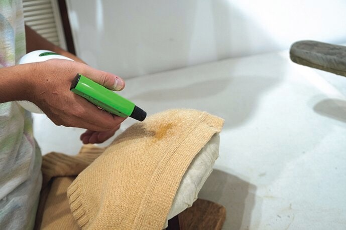縫い終わり、穴がしっかりと閉じたら生地の整形。手縫いで乱れたウールを整えていく。まずは霧吹きを使って補修部分を軽く湿らせる。