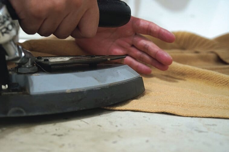 補修部分にスチームアイロンをかけていく。ぎゅっと押し付けるのではなく、5mm〜1cmほど浮かして熱いスチームを生地に当てるイメージ。