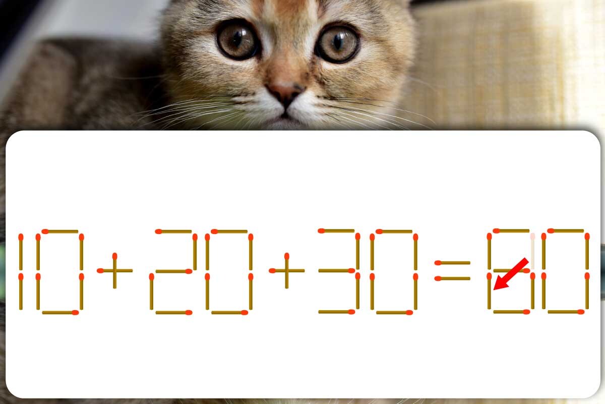 まず「9」の右上にある縦向きのマッチ棒を取ります。取ったマッチ棒を「9」の左下に置いてみましょう。ご覧ください、数字が「60」に減りましたね!十の位をあわせることで、式が「10+20+30=60」になり、正しい式が完成しました!
