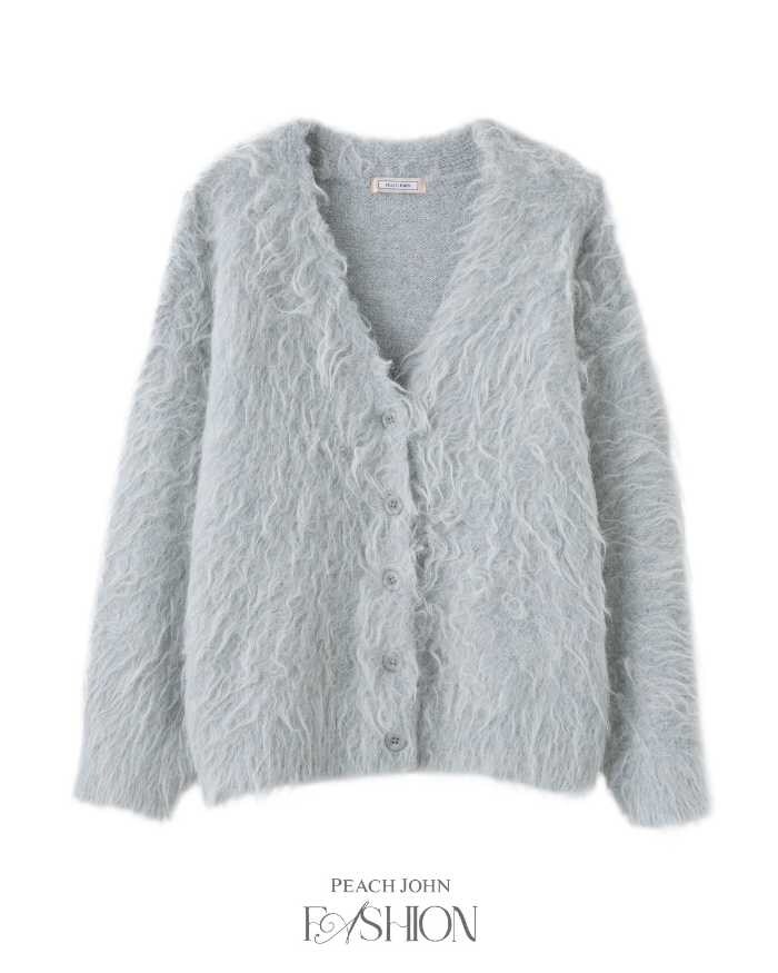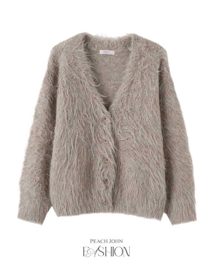 「シャギールーズニットカーディガン」(8,800円/ワンサイズ/ピンク・グレー・モカ)は、長い毛足が冬らしい存在感を放ちつつ、シンプルで合わせやすい万能アイテム。