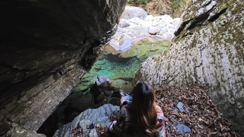 水晶淵の特に感動したところが、仁淀ブルーが綺麗なのはもちろんなんやけど、川沿いにある洞窟みたいな場所。