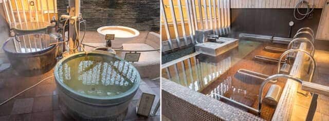 源泉が65度と高いため入りやすい温度に加水されている壺湯は、体を沈めるとドバっと温泉があふれるので贅沢気分を味わえます。寝湯ではのんびり寝ころびながらきれいに組まれたルーバーを見上げるのも楽しいひと時でした。